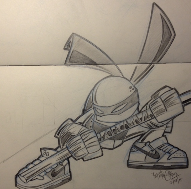 Tracy Tubera AKA The Uber Illustrator Supreme is another artist that I look up to and inspires me. I love how he incorporates different shoes in all his drawings. That's what inspired me to come up with this sketch. In 2008 the nike SB Mid's Donatello's were released and I decided to draw Donatello wearing the Donatello's lol